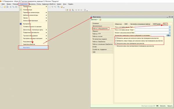 1.На закладке «Оборудование» → группа параметров «Работа с весами» надо установить флаг «Загружать в весы».