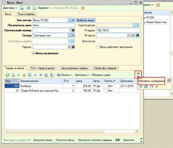 - Если в товарах есть дополнительный ресурс (картинка, сообщение или файл), который нужно передать в весы, нажмите кнопку «Обновить сообщения» закладки «Товары в весах».
