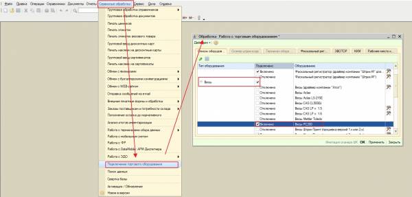 1. Установить флаг «Весы PC200» — «Сервисные обработки» → «Подключение торгового оборудования» → группа типа оборудования «Весы».