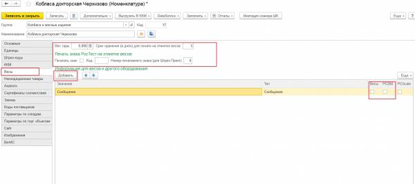 В карточке товара необходимо задать параметры для выгрузки в весы: