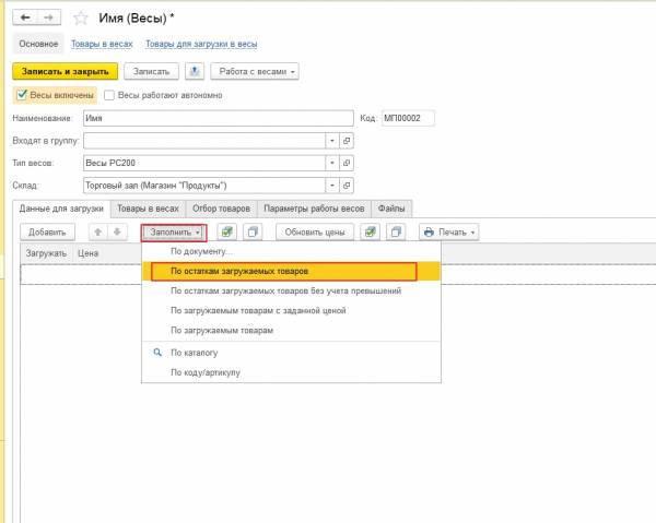 - В карточке весов на закладке «Товары в весах» нажмите кнопку «Заполнить» и выберите необходимый способ заполнение (Например, «По остаткам загружаемых товаров»).