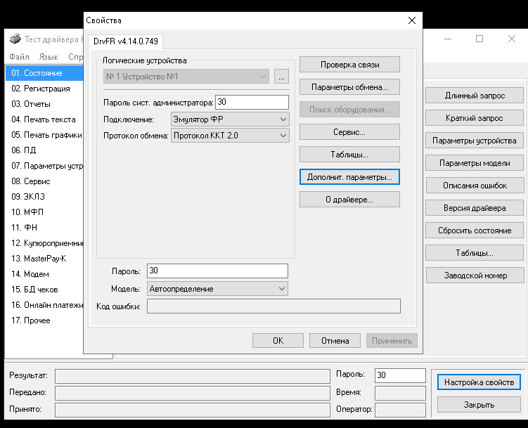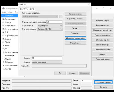 Открыть Тест драйвера ФРа, выбрать Настройка свойств – Дополнит. Параметры