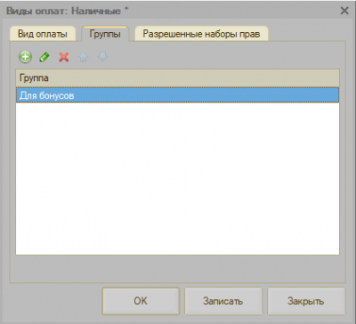 1) У всех видов оплат, при оплате которыми будут начисляться бонусы, указать группу видов оплат надбавки («Настройка» → закладка «Дополнительные» → кнопка «Настройка видов оплат»). Вид оплаты «Бонусами» указывать не нужно, чтобы бонусы не начислялись за оплату ими же.