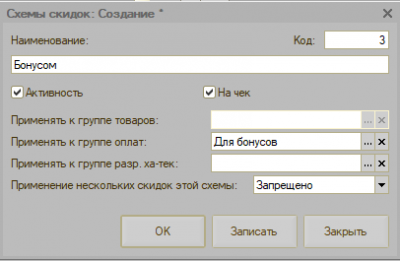 2) В схеме скидки/надбавки («Настройка» → закладка «Скидки/надбавки» → группа настроек «Автоматические скидки/надбавки» → группа «Схемы скидок/надбавок») нужно у реквизита «Применять к группе оплат» выбрать ту группу, к которой относятся нужные виды оплат