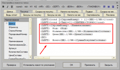 Для корректной печати чеков при работе с АТОЛ-ом нужно в настройках макета чека («Настройка» → закладка «Касса» → кнопка «Настройка вида чека» → кнопка «Макет чека» → закладка «Покупка») убрать выводимую в чек информацию: