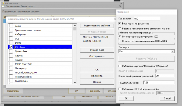 Для этого в видах оплат должен быть вид, который будет использоваться для безналичной оплаты. Далее необходимо сделать настройки в менеджере оплат. Для этого нужно в форме видов оплат нажать на кнопку «Параметры платежных систем», а потом на кнопку «Параметры».
