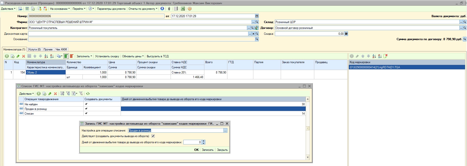 1. В Расходную накладную добавить товары и отсканировать их КМ, провести документ.