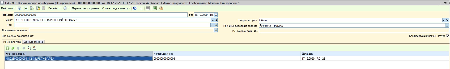 6. Также, документы Вывод товара из оборота можно создать вручную, заполнив в них КМ из расходной накадной, указать Номер документа и дату документа продажи.