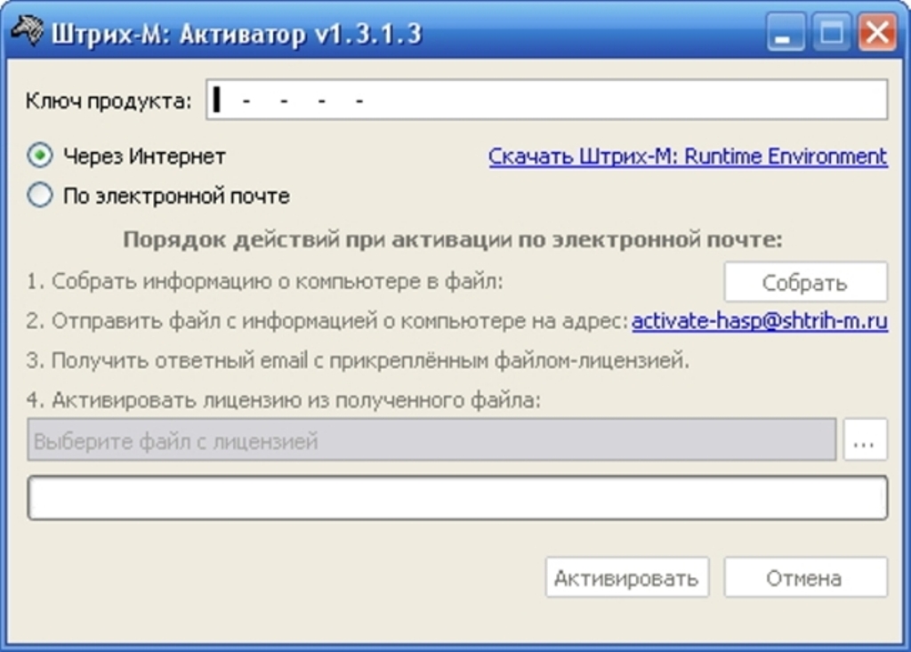 Активация лицензий осуществляется через интернет или через e-mail и только с помощью утилиты ShtrihActivator.exe. Данный файл устанавливается вместе с конфигурациями Штрих-М.