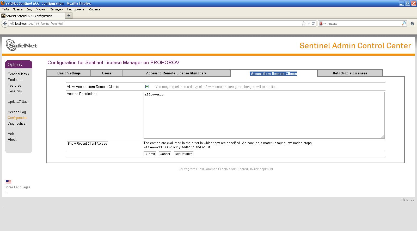 Для того чтобы разрешить доступ к лицензиям с определенных компьютеров необходимо установить флаг «Allow Access from Remote Clients» и задать список компьютеров в поле «Access Restrictions» в следующем формате: