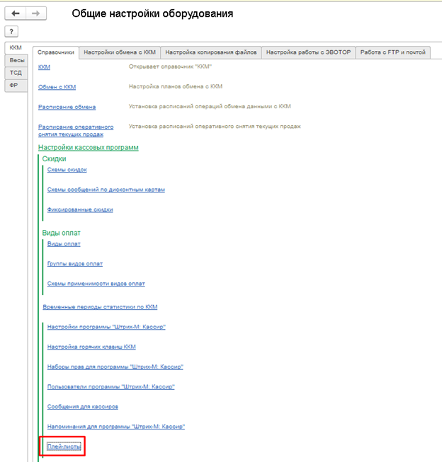 (Администрирование → Параметры работы с оборудованием, закладка «Справочники», пункт «Плей-листы»)