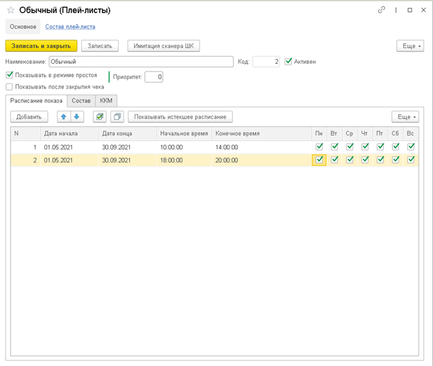 На данной закладке указываются строки с расписанием показа плей-листа: