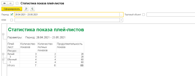 В отчет выводится информация по документам «Статистика показа плей-листа» за выбранный период.