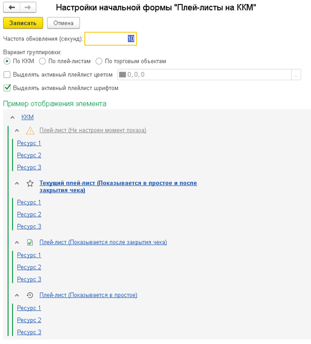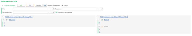 При варианте группировки по плей-листам или торговым объектам выделения текущего плей-листа нет, так как для каждого ККМ это зависит от привязанных к ней плей-листов.